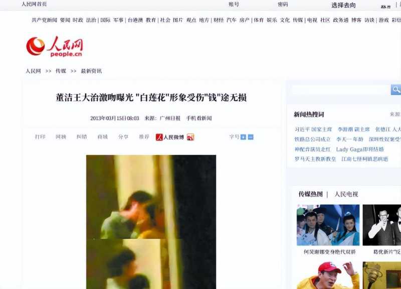 董洁王大治激吻曝光 白莲花形象受伤钱途无损.人民网.2013-03-15