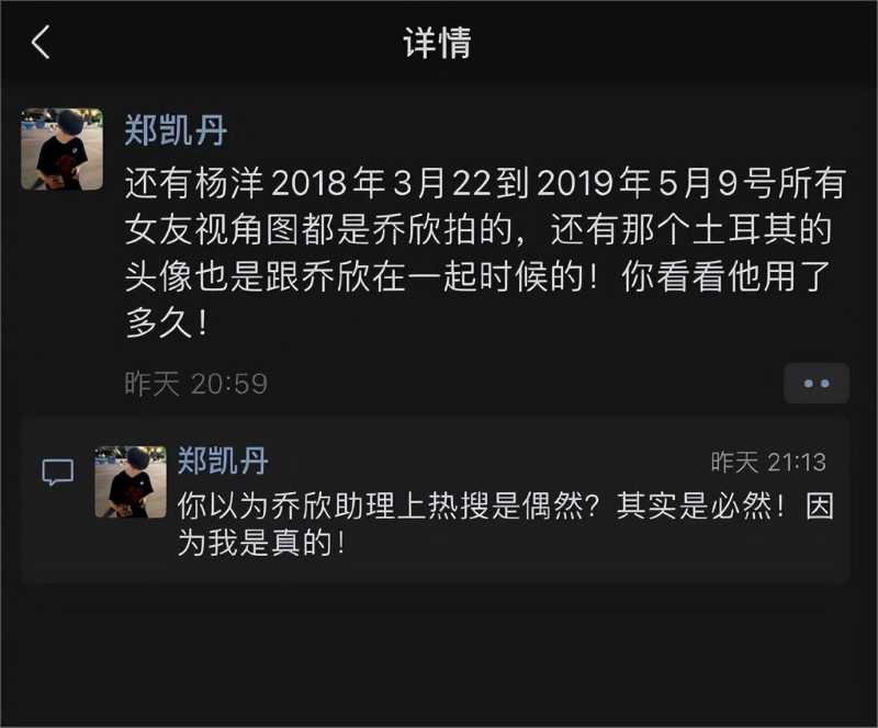 同时,乔欣也直言自己是被杨洋伤的最深,但杨洋自己却表示:“其实我不懂,我怎么了?不仅如此,早在2018年3月22日到2019年5月9日之间杨洋社交平台所有的女生视角照片都是乔欣拍的,甚至连当初杨洋在土耳其的头像都是乔欣拍的。