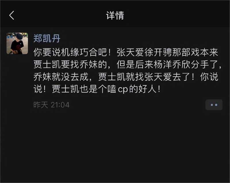 同时,还表示张天爱和徐开骋之前合作的那部戏本来女主就是乔欣,但由于当时自己被伤的太深,所以,最终贾士凯才找张天爱顶替的女主。