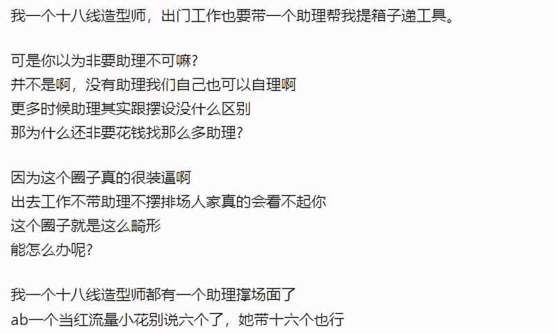 早前有个自称18线造型师的网友发文,称自己出门也会带助理,并非有多需要,只是这行规矩就如此,不带助理会被人看不起。这种风气近些年才形成,《父母爱情》里的刘琳老师说,从前演员无论主角还是配角都一视同仁,大家住同一楼,吃同样的盘饭,哪像现在分等级了。