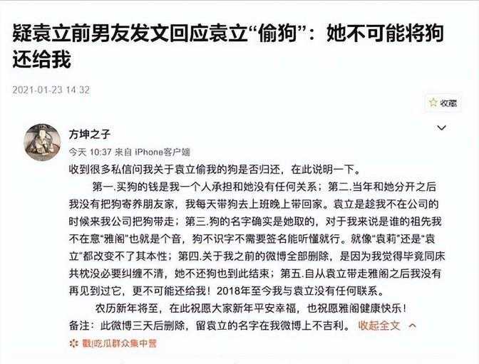 原来,这条名叫"雅各"的小狗有两个主人,一个是袁立,另一个是袁立的前男友。两人分手后,袁立带走了这条狗,而她的前男友则在网上发帖讨要。面对这种指责,袁立选择了沉默,没有做出任何回应。