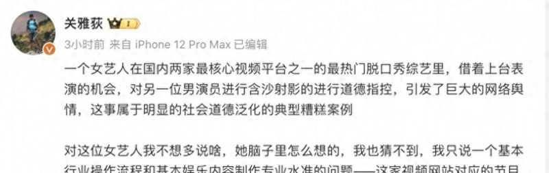 关雅荻表示,让一个女艺人在全国数千万观众面前,公开含沙射影地对另一个男演员进行道德攻击,这种做法简直不可思议!她怒怼节目组:"你们是怎么想的?就凭一张嘴就可以随意攻击他人吗?难道'开玩笑'就能成为你们的挡箭牌?"