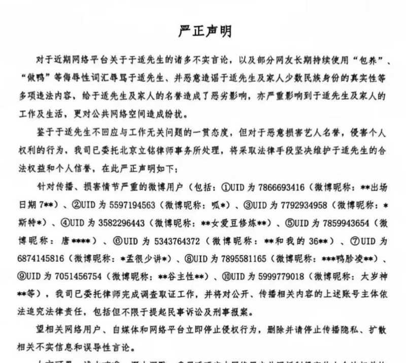 面对铺天盖地的猜测和指责,于适选择了沉默。直到9月15日,他的工作室才发布声明,称将对网络上的不实言论采取法律行动。这是要打官司?还是只是虚张声势?大家拭目以待!