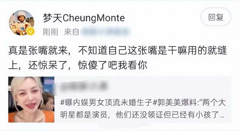 她表情夸张故作神秘地说,内娱有一位顶流东北男星和来自新疆的一位顶流女星,两人并没结婚,但已经生下了小孩,这事在京圈里都知道。