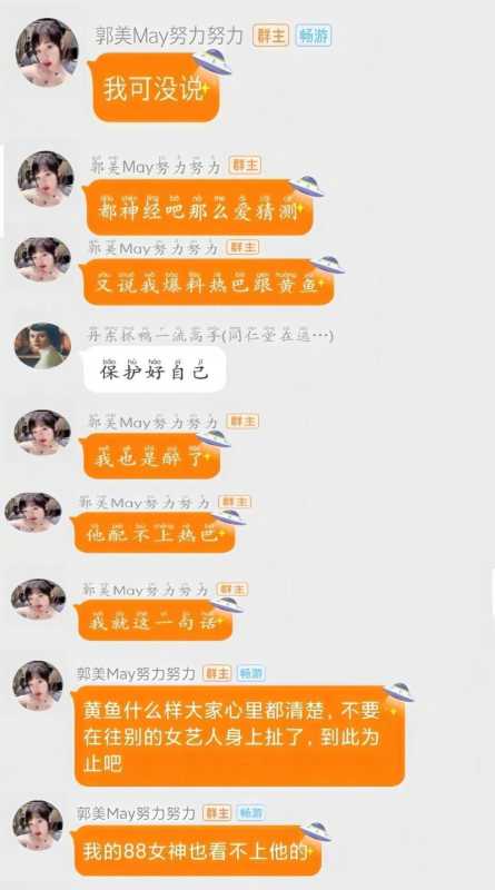 与此同时,迪丽热巴方辟谣后,郭美美也在粉丝群进行辟谣,否认自己爆料的是热带鱼 cp,还吐槽大家乱猜测,把迪丽热巴称作自己的女神,还称黄景瑜配不上她。