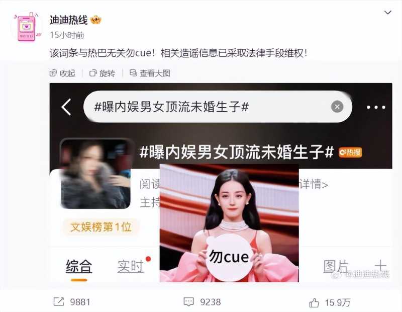 当天晚间,迪丽热巴工作室的辟谣专号发出紧急声明,表示相关热搜词条与迪丽热巴无关,并称已对相关造谣信息采取法律手段维权。