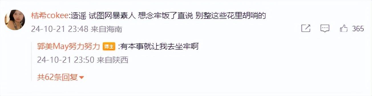 还有网友指责她“造谣,试图网暴素人,想念牢饭了直说,别整这些花里胡哨的”,郭美美也是霸气喊话,“有本事就让我去坐牢啊”。