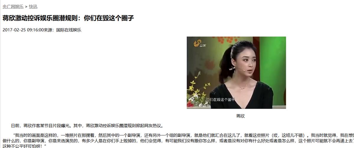 根据国际在线娱乐的报道,这个事情刊登于2017年2月25日发布的《蒋欣激动控诉娱乐圈潜规则:你们在毁这个圈子》