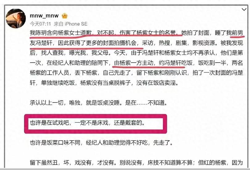 11月13日晚,一位名为“MNW_MNW”的女网友在社交媒体上发布了一则爆炸性消息,称杨紫睡了她的前男友、某杂志CEO冯楚轩,并指控杨紫为了获得时尚资源,不惜用身体交易。这一消息迅速在网络上发酵,引发了广泛关注和讨论。