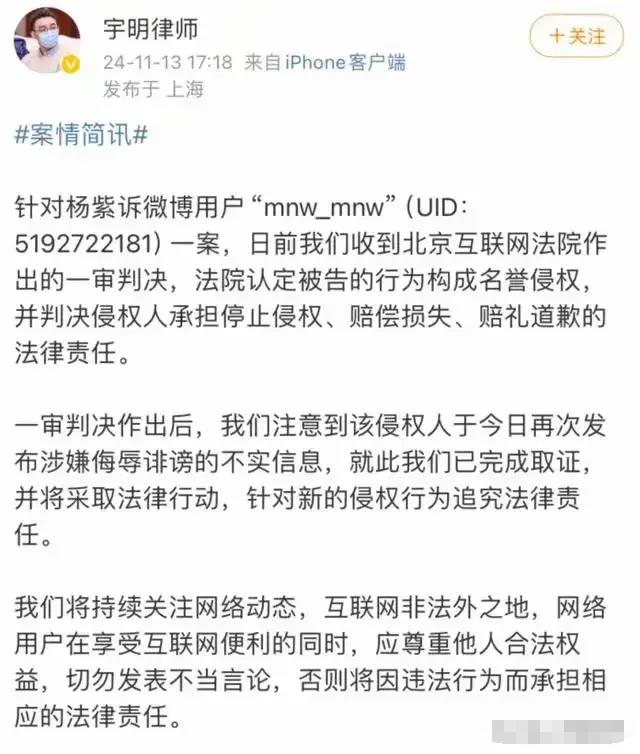 还没过去一天时间,在网上发帖的这位网友就收到了法院的判决书,称法院判决其要给杨紫道歉,停止侵权,赔偿损失,文中虽还满是不屑和愤怒,但也证明了自己所言确定全是造谣。