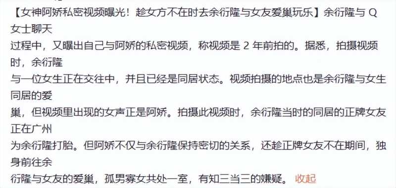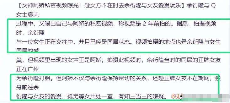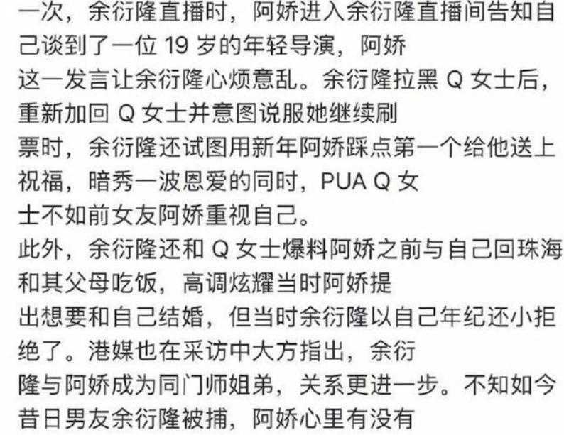 在余衍隆与阿娇交往期间,Q女士感受到了被冷落的滋味,于是心生不满,最终选择将两人的关系公之于众。