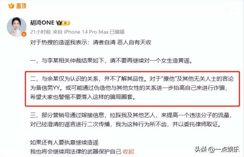 面对余衍隆的爆料,女网红胡湾在社交媒体上做出了回应。她表示自己只是认识余某,并不熟悉,也不了解他的品性。同时,她还表示要为自己维权,追究余衍隆的法律责任。这一回应无疑让事件更加扑朔迷离,也让人们更加期待后续的发展。
