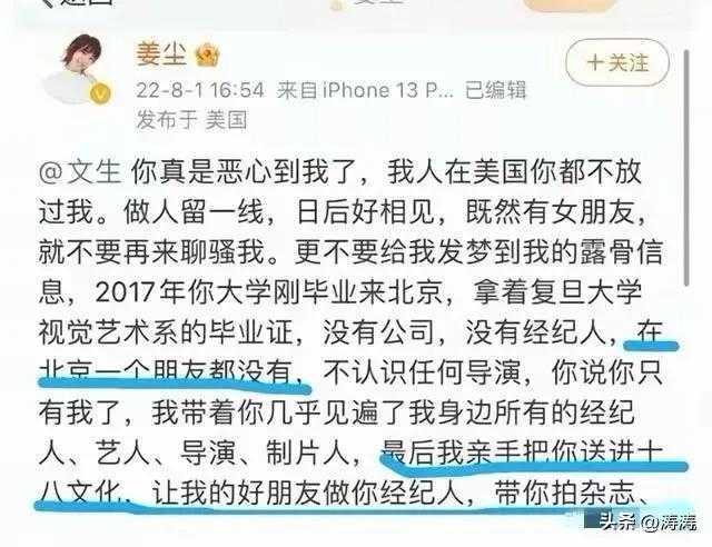 在爆料中,姜尘详细讲述了与这位“资深男演员”的感情经历。从开始的温柔体贴,到后来的控制欲和暴力,再到最后的背叛和拍摄私密视频,就像电影一样。她描述了自己如何一次次被伤害,从被打耳光到被锁在阳台上,这些让人害怕。而这一切,都发生在看似美好的娱乐圈,让人对娱乐圈的阴暗面深感忧虑。