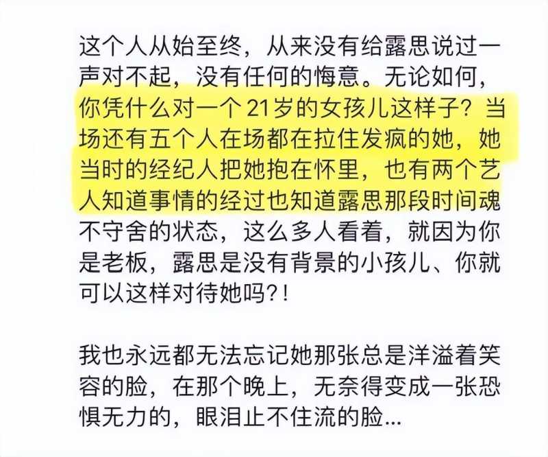 这位老板,在赵露思试戏表现不佳后,竟然将她拖入厕所,进行了长达两小时的言语侮辱。在这一过程中,赵露思疑似遭受了肢体暴力,身心均受到了严重的伤害。在场的五人虽然试图拉住发疯的老板,但赵露思的内心已经彻底崩溃......