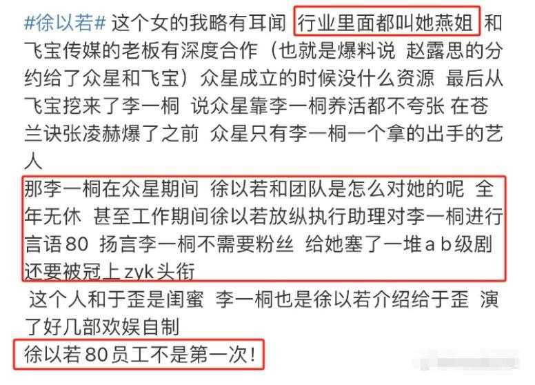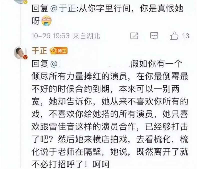于是矛头直指她当时的经纪人徐以若,而于正的牵扯,完全是大家又扒出,于正和这位经纪人是关系很好的挚友,甚至还为她发文暗示过赵露思。