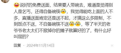 也有谴责他做得不够周到,吐槽道:“说是免费送面,你却不送碗,倒不如不送。”