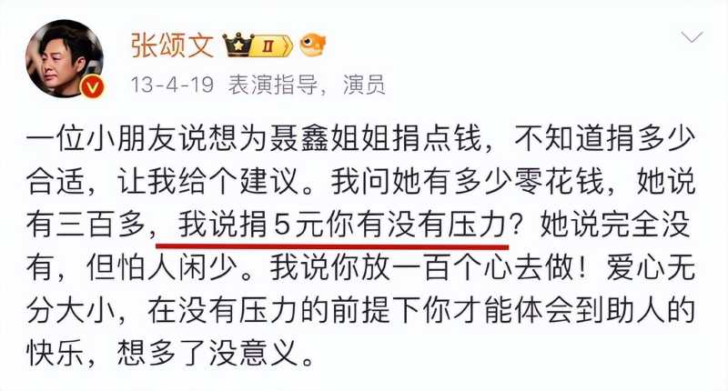 张颂文当时并没有让网友把钱全捐了,而是回复他说:“如果没有压力,捐5元就好了。”