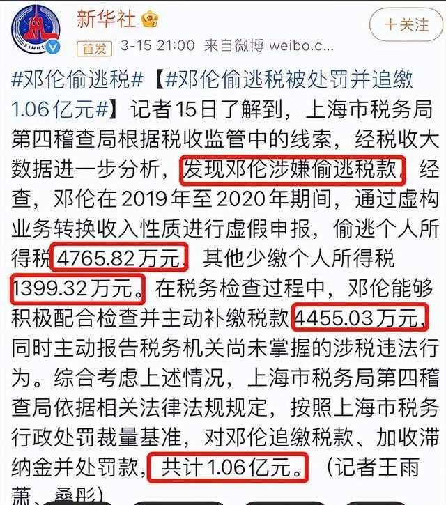 时间金额:2022年3月,上海市税务局第四稽查局依法对邓伦偷逃税案件进行处理,追缴并罚款1.06亿元。