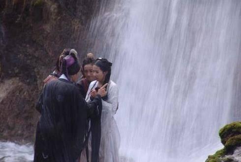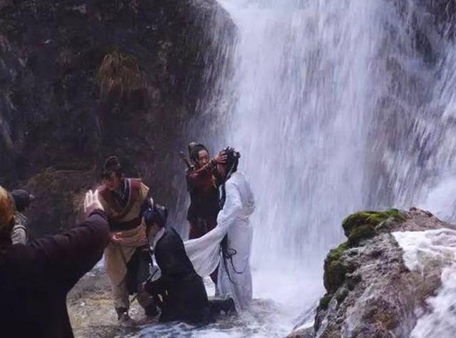 本来在岸边的刘亦菲不知不觉踏进了水中,又在导演没发现的情况下,朝着瀑布越走越近。