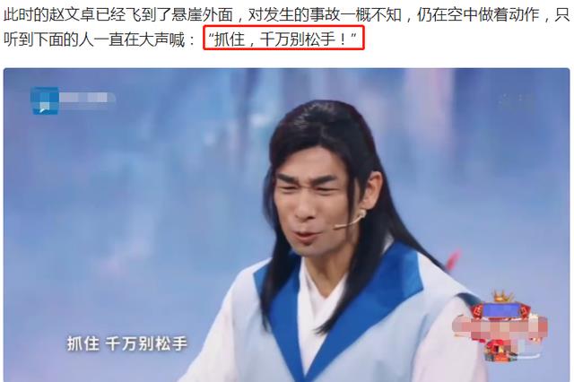 不知是风力太过强大,还是道具组人员出现失误,刚被吊上空中的瞬间,赵文卓身上的威亚就断了两根。