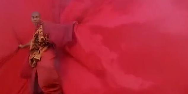 镜头中的他腾空而起,身穿鲜红的袈裟。
