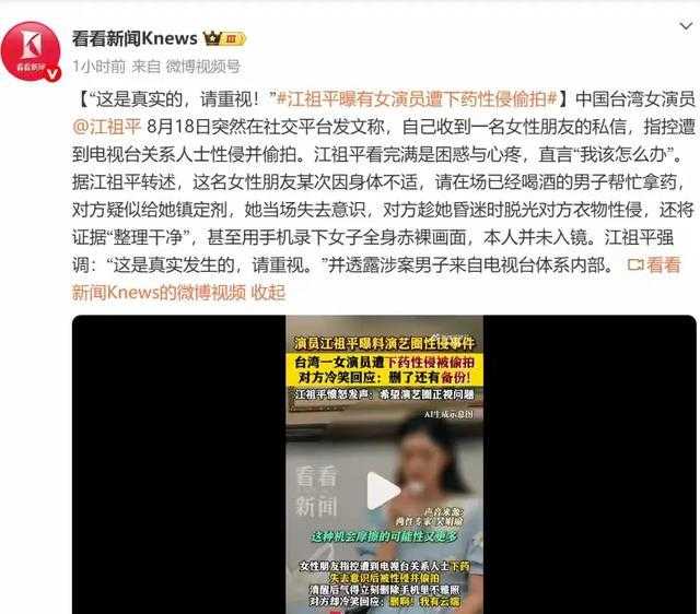 8月18日,中国台湾女演员江祖平在社交平台的一则发文,犹如一颗重磅炸弹,在演艺圈乃至整个社会激起千层浪。她收到一名女性朋友的私信指控,让演艺圈隐藏的黑暗角落瞬间暴露在大众视野之下。