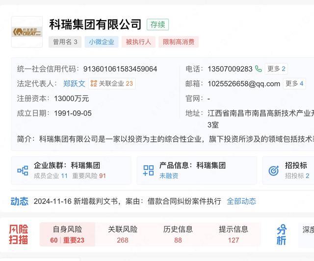 企查查资料显示,郑跃文担任法定代表人的科瑞集团目前仍被列为被执行人,面临多项债务纠纷和法律诉讼,昔日的资本帝国已经风光不再。