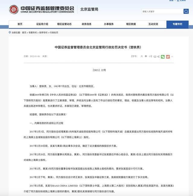 2022年1月,证监会对楚轶男处以40万元罚款。调查期间,楚轶男多次更换手机号码、出境躲避调查,这些行为加重了其违法情节。内幕信息知情人郑跃文的弟弟郑跃武也因同一内幕交易行为被查处,没收违法所得237.96万元,并处以713.88万元的罚款。