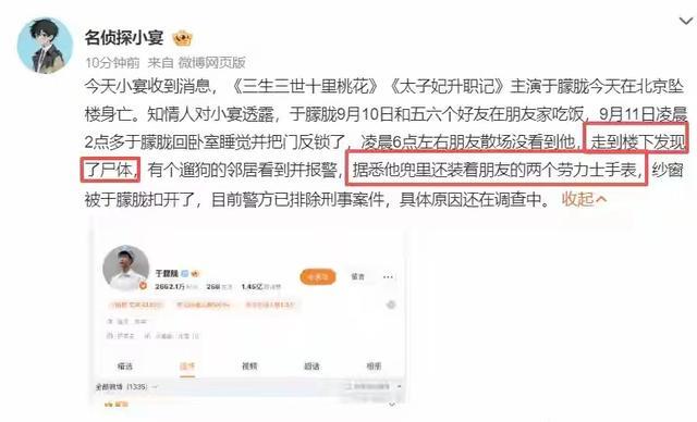 9月11日中午,某自称资深娱记的博主突然在社交平台发帖,声称“于朦胧在今天上午坠楼身亡”。