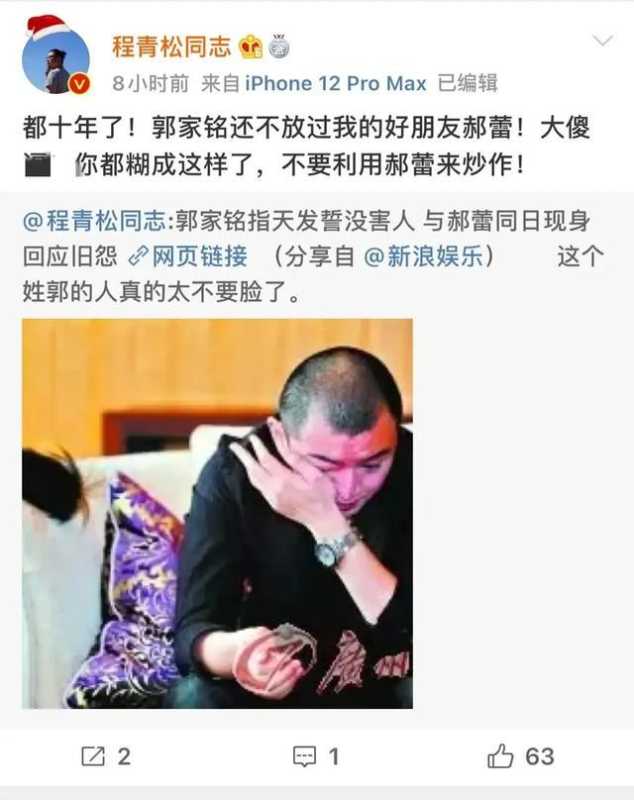 21年的时候,郭家铭突然拿和郝蕾的旧情来炒作,一下子把郝蕾的口碑搞得很差。程青松立马站出来,发了好多条博文痛斥郭家铭,还反复强调郝蕾是自己的“好闺蜜”。估计郝蕾看到程青松这么仗义,心里也是满满的感动。后来郝蕾还专门请程青松到家里吃饭,亲自做了火锅招待他,两人从傍晚一直聊到第二天凌晨,一聊就是8个小时,这关系,绝对是真朋友。可现在程青松因为于朦胧这事儿,被大家扒了个底朝天,名声一落千丈,也不知道郝蕾心里是怎么想的,是心疼呢,还是早就有预感,或者是特别同情他,还依然相信他呢?