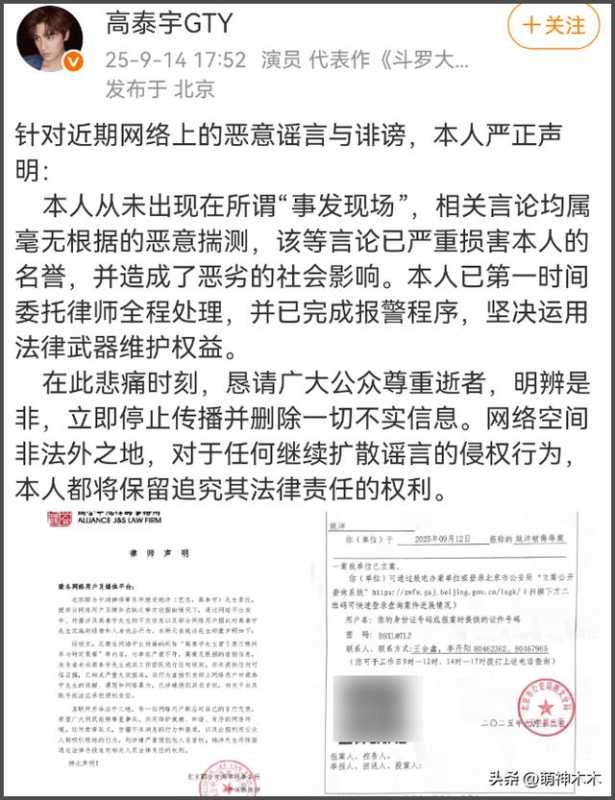 而仅仅是因为比工作室早发了悼念信息的高泰宇,也被网友在评论区怀疑并攻击,逼得他不得不报警并发布律师声明澄清。