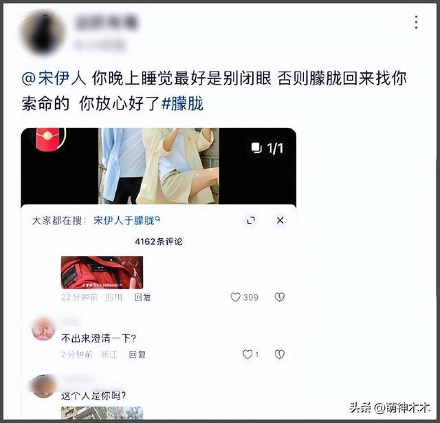 目前上述明星艺人评论区已经沦陷,宋伊人全平台评论区全都充斥着网友的质疑谩骂,甚至还有人跑到宋伊人妈妈评论区开麦,行为恶劣,让人不适。