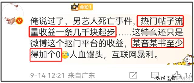 据大V爆料,在微博发布相关事件,热门帖子流量收益一条就几千块起步,而在短视频平台和某书,一条热门帖收益甚至要上万,堪称“互联网暴利”。
