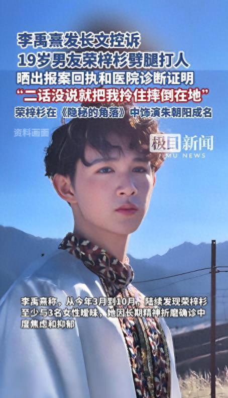 近日,一场围绕19岁演员荣梓杉的情感纠纷引发舆论海啸。中戏毕业生李禹熹发布万字长文,揭露与荣梓杉恋爱期间遭受的暴力对待与精神控制,细节触目惊心,令人唏嘘。