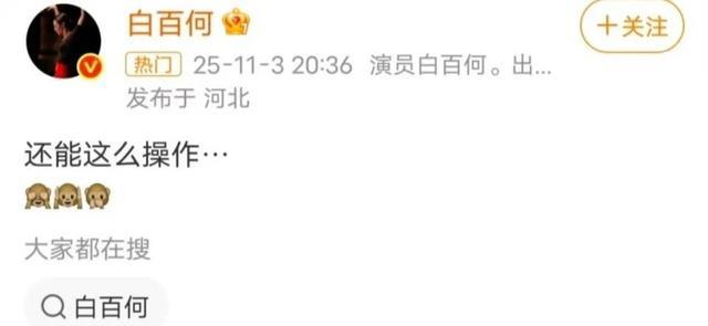 最终引爆大众讨论的是白百何在社交平台上发布的一条动态,称“还能这么操作”,随后附带了捂嘴的几个表情。