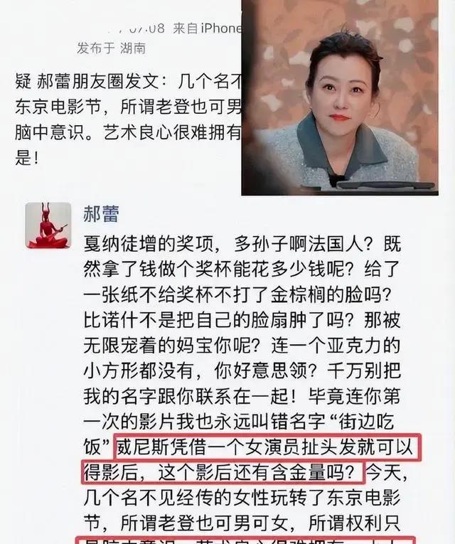 后来有网友发现郝蕾监制并主演的《地下美人》也同样入围东京电影节,但却颗粒无收,可能是在打击和失落之下通过朋友圈发泄不满。