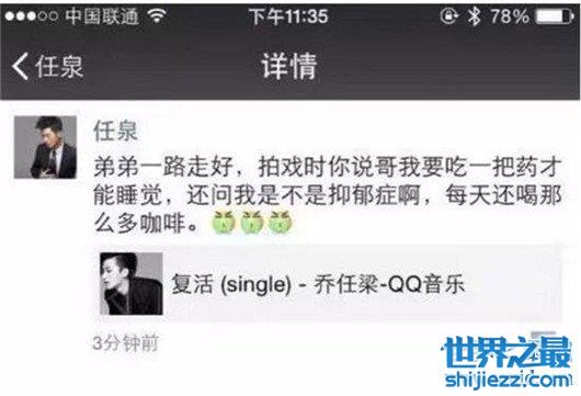 比如某个知名娱乐博主发微博说,乔任梁头上的塑料袋是乔任梁自己套上的为的就是自杀这些都是因为他的抑郁症。 乔仁良去世的消息传出后不久,他的朋友任泉也写了一封悼念信,说乔任梁自己拍电影时,透露自己每天必须服几剂药才能入睡,并询问自己是否情绪低落。