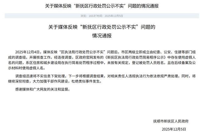 2025年12月4日,媒体反映“区执法局行政处罚公示不实”问题后,市区两级立即成立由纪委、公安、住建等部门组成的调查组,开展核查工作。经连夜调查,区政府官网发布的《新抚区执法局行政处罚简易程序公示》中存在使用虚假人名的问题,系区住房和城乡建设局在执行简易处罚程序过程中,未按有关规定,登记被处罚人员姓名,且在后续备案及公示材料时使用虚假人名。