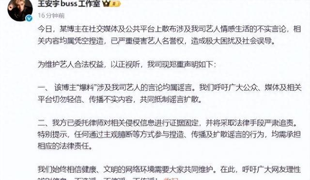 事情可不简单。1月3日早晨,王安宇工作室就传得沸沸扬扬的关晓彤恋情传闻发表了澄清声明。这波操作,是要公开打脸一众造谣者吗?王安宇明白着声明称,那些所谓的“恋情”都是胡编乱造,大喊大家别轻信这些谣言。还说已经请了律师,要用法律手段维护艺人的名誉。