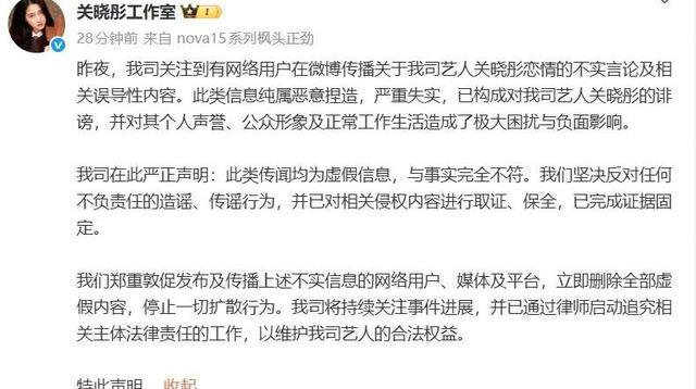 关晓彤这边怎么回事呢?同一天,她团队也紧急发声明,声称网上流传的关于她的绯闻全是无稽之谈,对她可是造成了“极大困扰”。听起来还是蛮认真,不是说说而已,他们已经收集证据,要找造谣者麻烦。