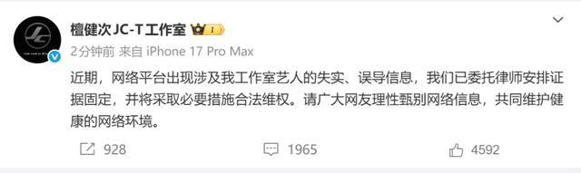 檀健次工作室也发布声明称,网络平台出现涉及我工作室艺人的失实、误导信息,我们已委托律师安排证据固定,并将采取必要措施合法维权。请广大网友理性甄别网络信息,共同维护健康的网络环境。