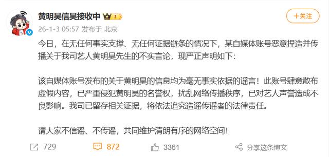 黄明昊工作室:“该自媒体账号发布的关于黄明昊的信息均为毫无事实依据的谣言!我司已留存相关证据,将依法追究造谣传谣者的法律责任。”
