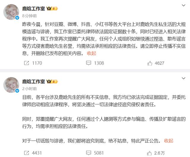 对此,鹿晗工作室凌晨连发两条回应,称对于鹿晗私生活的大规模造谣与诽谤已固定证据并进入法律程序,呼吁网友停止传播不实信息,并删除已发布的相关内容。