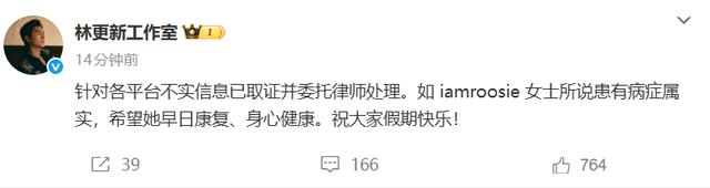 林更新工作室:“针对各平台不实信息已取证并委托律师处理。如 iamroosie 女士所说患有病症属实,希望她早日康复、身心健康。祝大家假期快乐! ”