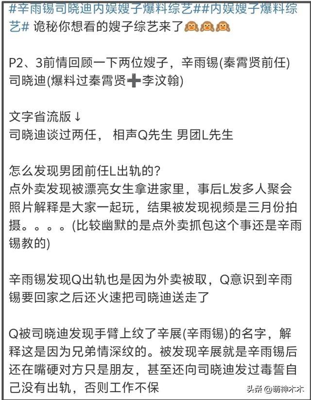 辛雨锡和司晓迪后续还坐下来一起爆料圈子里的男明星,不光详细聊起了司晓迪插足秦霄贤、辛雨锡的过程,提到了司晓迪至少谈过四五个男明星。