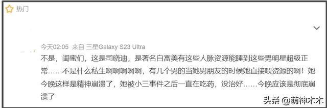 其实司晓迪不是第一次爆料了,她是男星李汶翰、秦霄贤的前女友,知情人爆料她身份的时候,提到了两个细节,一个是司晓迪能给男星资源,一个是司晓迪经历过被小三事件。