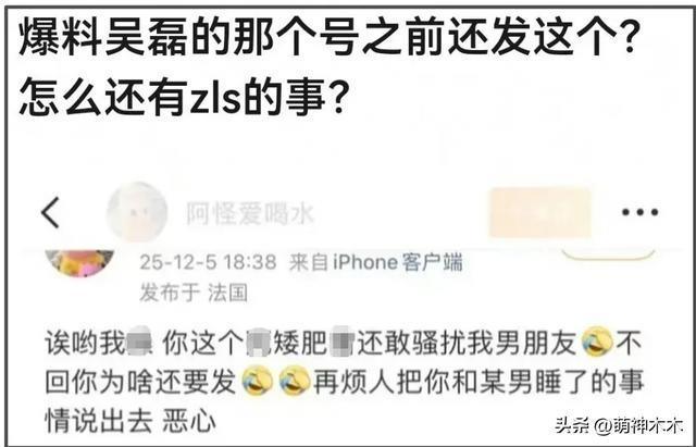 疑似爆料女主小号还发过一条动态,开口就是脏话,嘲讽某个又矮又胖的人骚扰她的男朋友(按照爆料女主的说法,她的男朋友正是一个叫吴磊的人)。