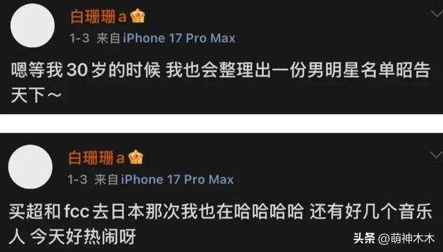 与此同时,网友考古了白珊珊的社媒账号,发现她在司晓迪爆料之后,还发了一条动态表示,等到她30岁也要整理一份男明星名单昭告天下,这又是要牵扯一大批明星的节奏?