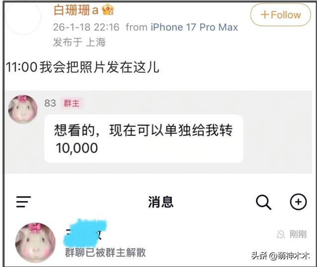 还有爆料女主本人,似乎有了偃旗息鼓的意思,她开了个群表示要发照片,要求网友付费被拒绝之后,火速解散了群,除了文字爆料,暂时没有拿出更多实锤。