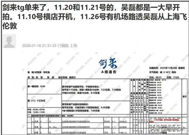 吴磊粉丝曝光了吴磊的行程,拿出了剧组通告单,力证吴磊11月20日在《剑来》剧组拍戏。